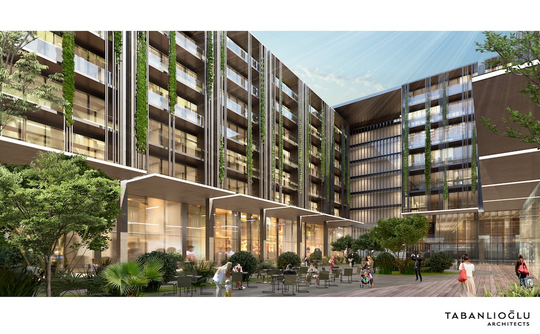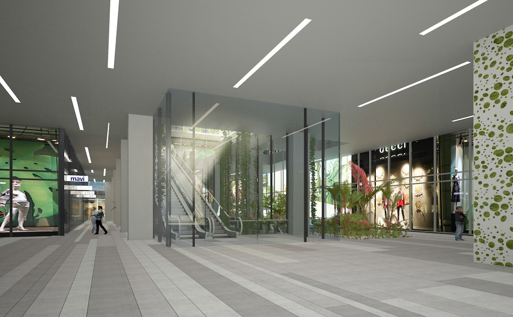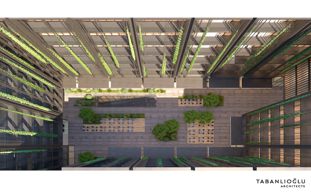 The project’s unique features include the ground floor, accessible on Halaskargazi Street, designed as a semi-open public space with restaurants, cafes, sitting areas, and street connections. The interior and exterior are intertwined, creating a breathing and living courtyard enriched with natural stones, benches, and installations. The landscape of natural plants provides a refreshing atmosphere that is well-lit and modern due to the transparent canopies that enable maximum use of sunlight and uninterrupted filtering of light to lower floors.